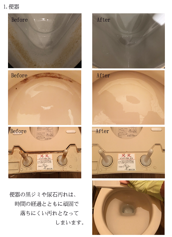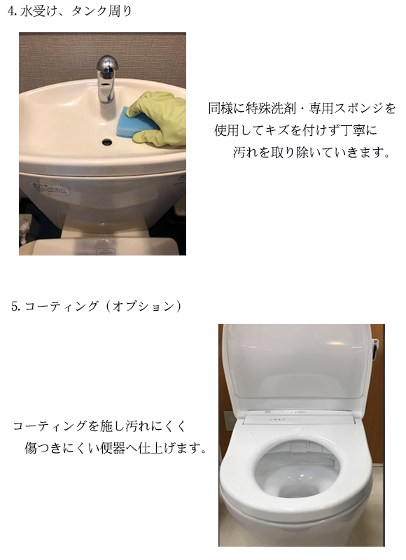 汚れの種類に応じて適した特殊洗剤・スポンジ等を使い、陶器・装着品へのダメージを最小限に抑えます。